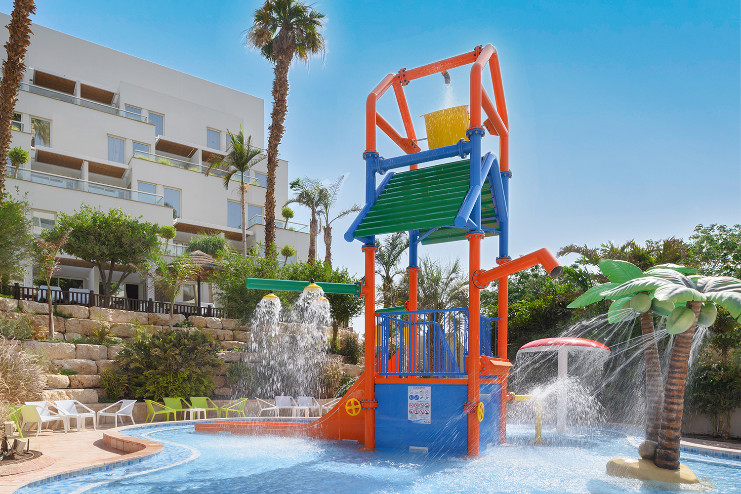 הכוללות מתקני פארק מים עם מגלשות ומזרקות, ובריכת שחייה דמוית חוף ים.