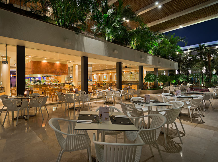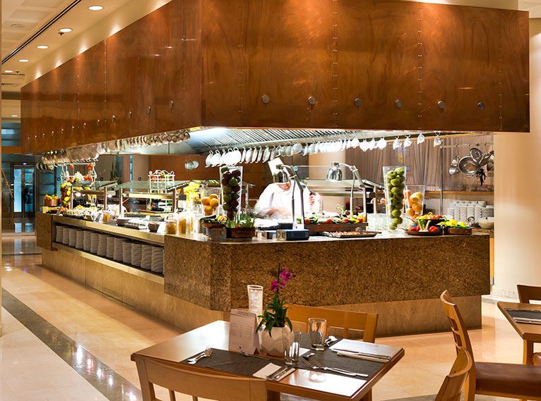 ארוחת הבוקר המוגשת להנאת האורחים מגוונת במיוחד, ומציעה שפע מנות דגים, סלטים, גבינות ומאפים טריים, לצד ירקות, פירות וקינוחים. הקפה והביצים, יוכנו לפי טעמכם וישלימו את החוויה הקולינרית העשירה. במזנון הערב מכינים השפים את הארוחה בעמדת ההכנה הניצבת במרכז המסעדה, לעיני הסועדים ולפי הזמנתם. האורחים נעים בין עמדות ארבעה מטבחים: מזרח רחוק, איטלקי, גריל בר ו'על הסכין' - נתחי בשר ועוף במגוון טעמים. למסעדה צמודה מרפסת גדולה המשקיפה אל הבריכה, וניתן לשבת ולסעוד בה.