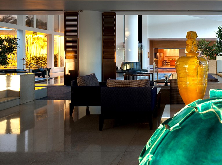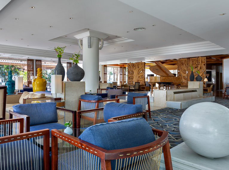 לובי 'הים האדום' במלון רויאל ביץ' אילת, נהנה ממרפסת יפהפייה ונוף פנורמי המשקיף אל מפרץ אילת,